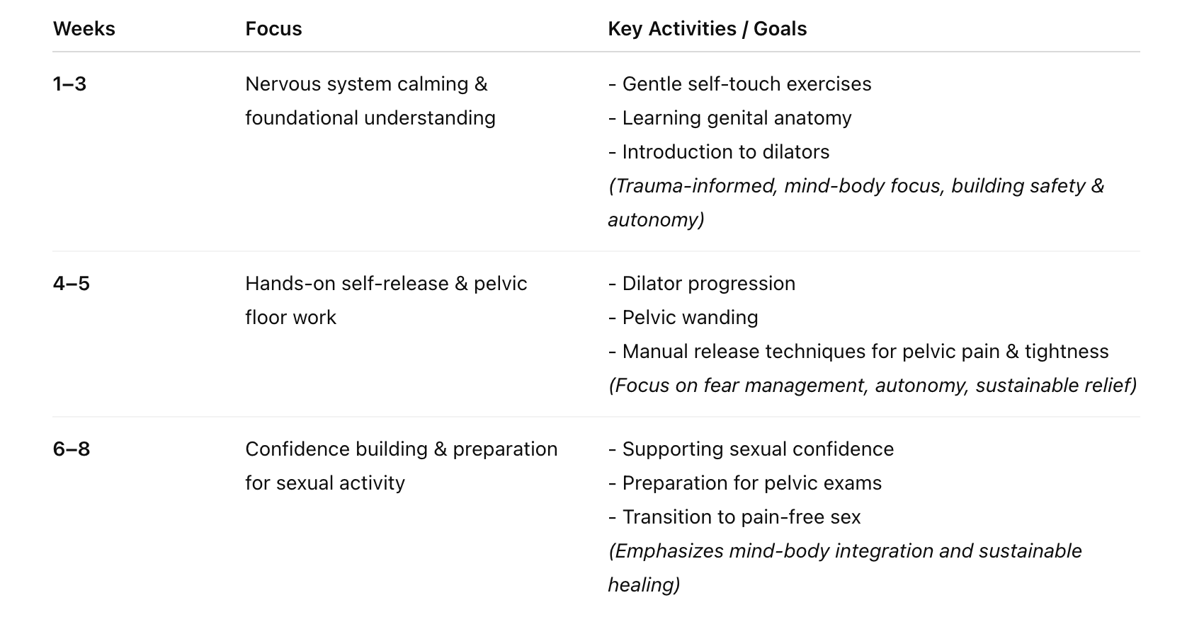 Specialized Expertise: We are remote pelvic floor physical therapist who actually specialize in vaginismus and sexual pain. This specialized experience gives us deeper insight than general pelvic floor therapists.